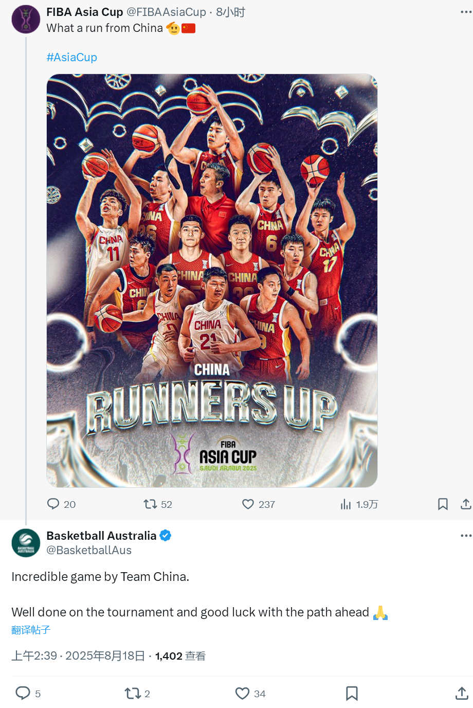 中国男篮的出色表现,赢得了对手的尊重。亚洲杯官方发布中国男篮夺得亚军的海报,澳大利亚男篮官方社媒在评论区写道:“中国男篮打出了难以置信的比赛表现!祝贺你们在比赛中取得好成绩,并祝你们未来一切顺利。”
